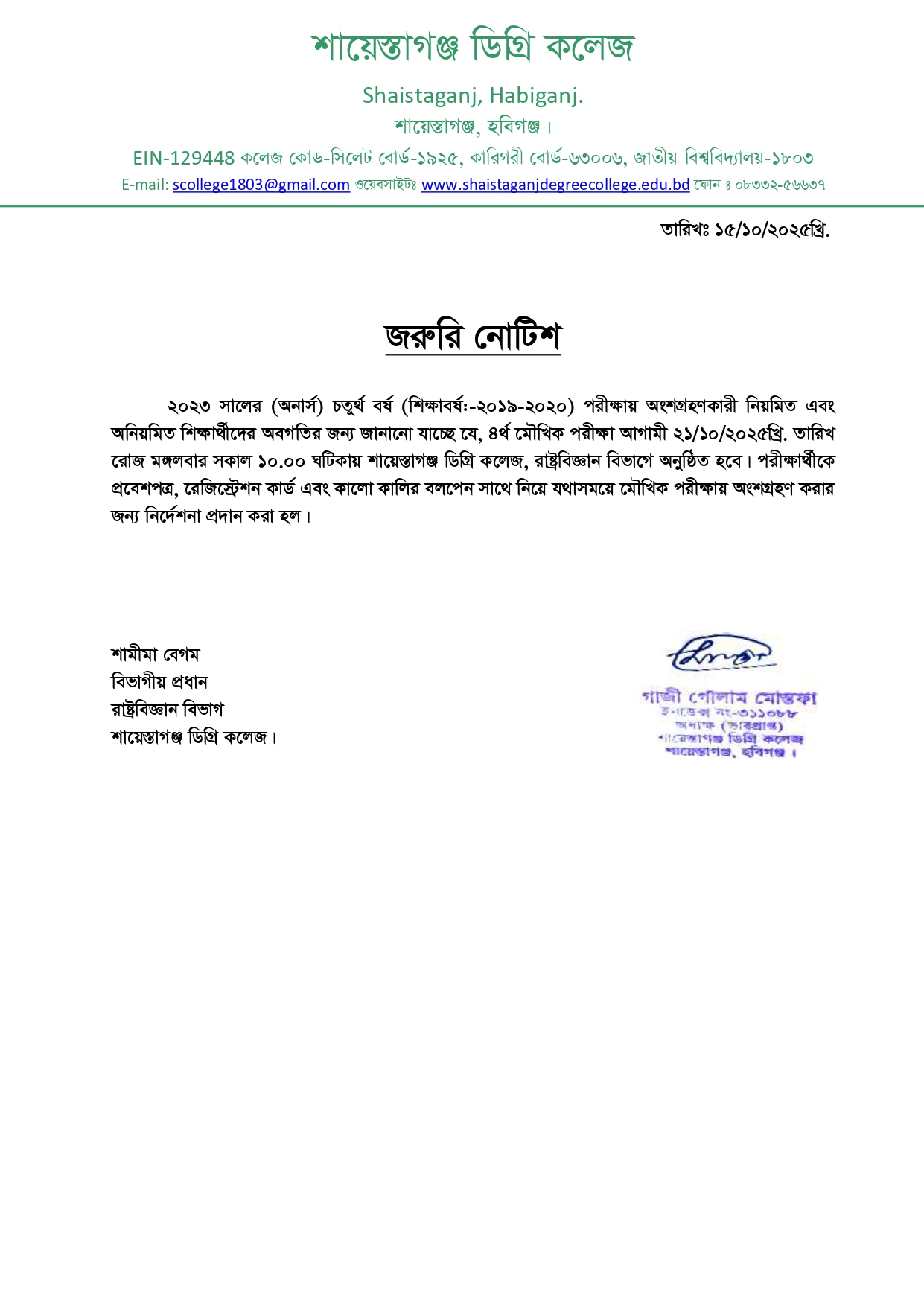 অনার্স বিভাগের রাষ্ট্রবিজ্ঞান বিষয়ের ২০২৩ সালের ৪র্থ বর্ষ পরীক্ষার্থীদের মৌখিক পরীক্ষা সংক্রান্ত জরুরি নোটিশ।
