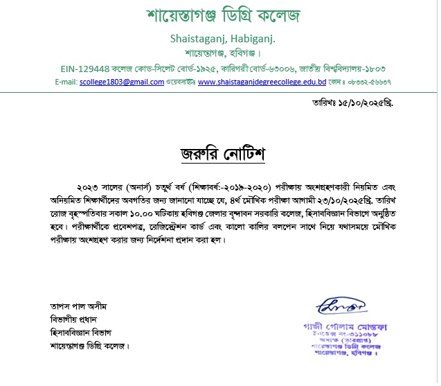 অনার্স বিভাগের হিসাববিজ্ঞান বিষয়ের ২০২৩ সালের ৪র্থ বর্ষ পরীক্ষার্থীদের মৌখিক পরীক্ষা সংক্রান্ত জরুরি নোটিশ।